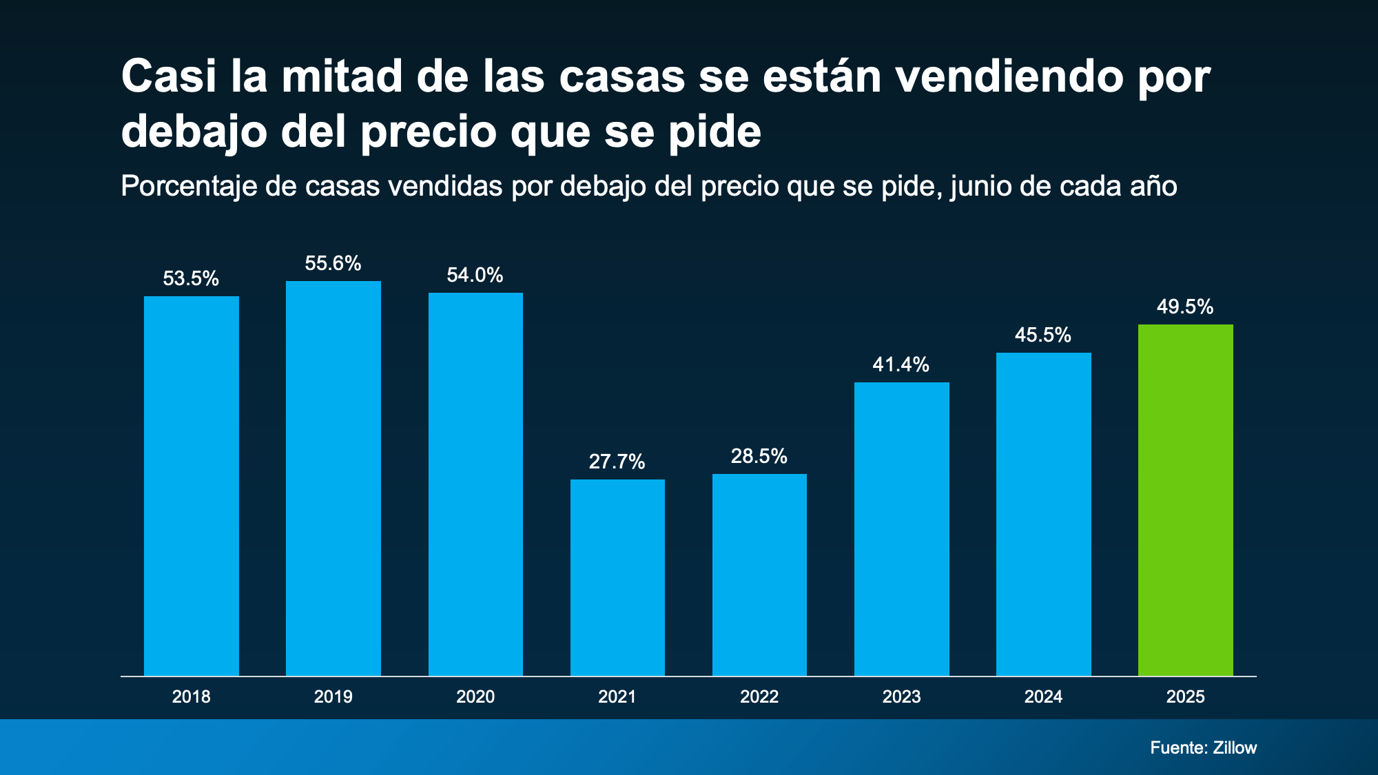 • 2025: El 50 % de las casas se están vendiendo por debajo de lo que se pide. Eso está mucho más cerca de lo que es típico en el mercado de la vivienda.