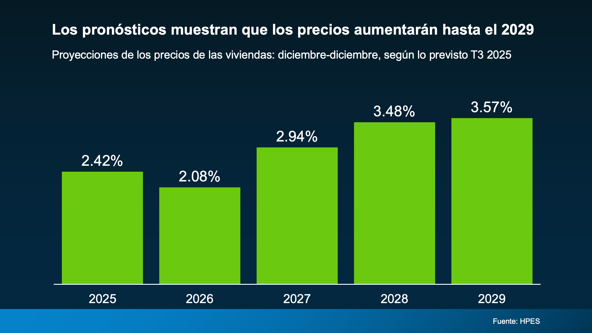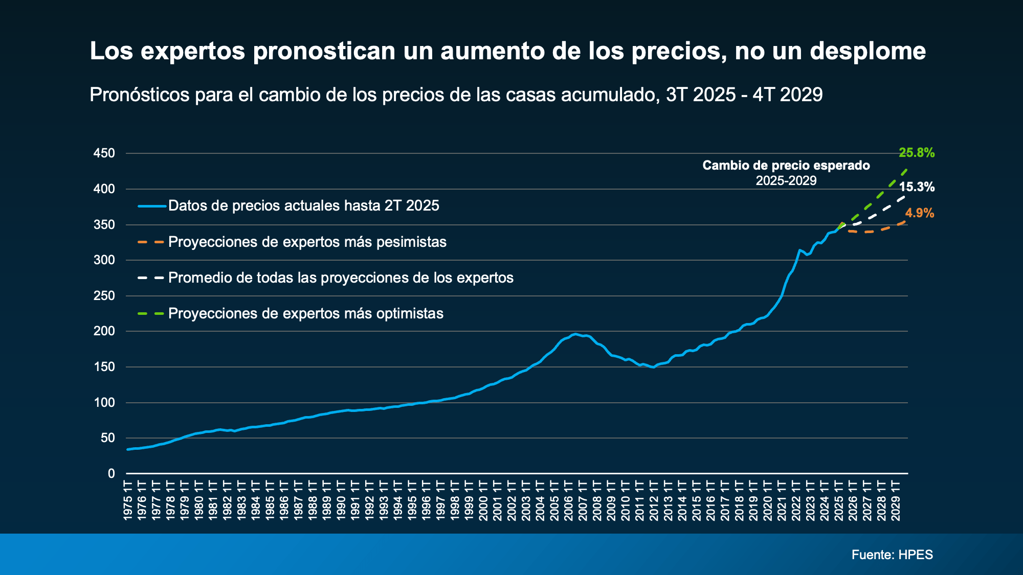 En la Encuesta de Las Expectativas de Los Precios de las Casas (HPES, por sus siglas en inglés) de Fannie Mae, cada trimestre más de 100 expertos líderes en el mercado de la vivienda opina sobre hacia dónde proyectan que irán los precios de las casas a partir de ahora. Y en el informe que se acaba de publicar, los expertos coinciden en que se proyecta que los precios suban a nivel nacional hasta al menos el 2029 (vea la gráfica a continuación):