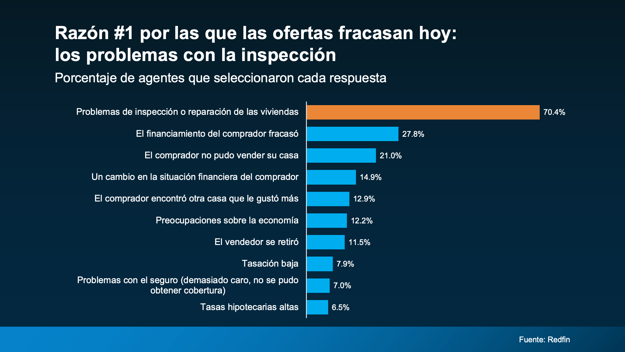 Usted podría suponer que la razón principal por la que los compradores se están retirando hoy es la financiación. Pero ese no es el caso. El factor decisivo más común hoy en día, por mucho, son los problemas con la inspección y reparación (vea la gráfica a continuación):