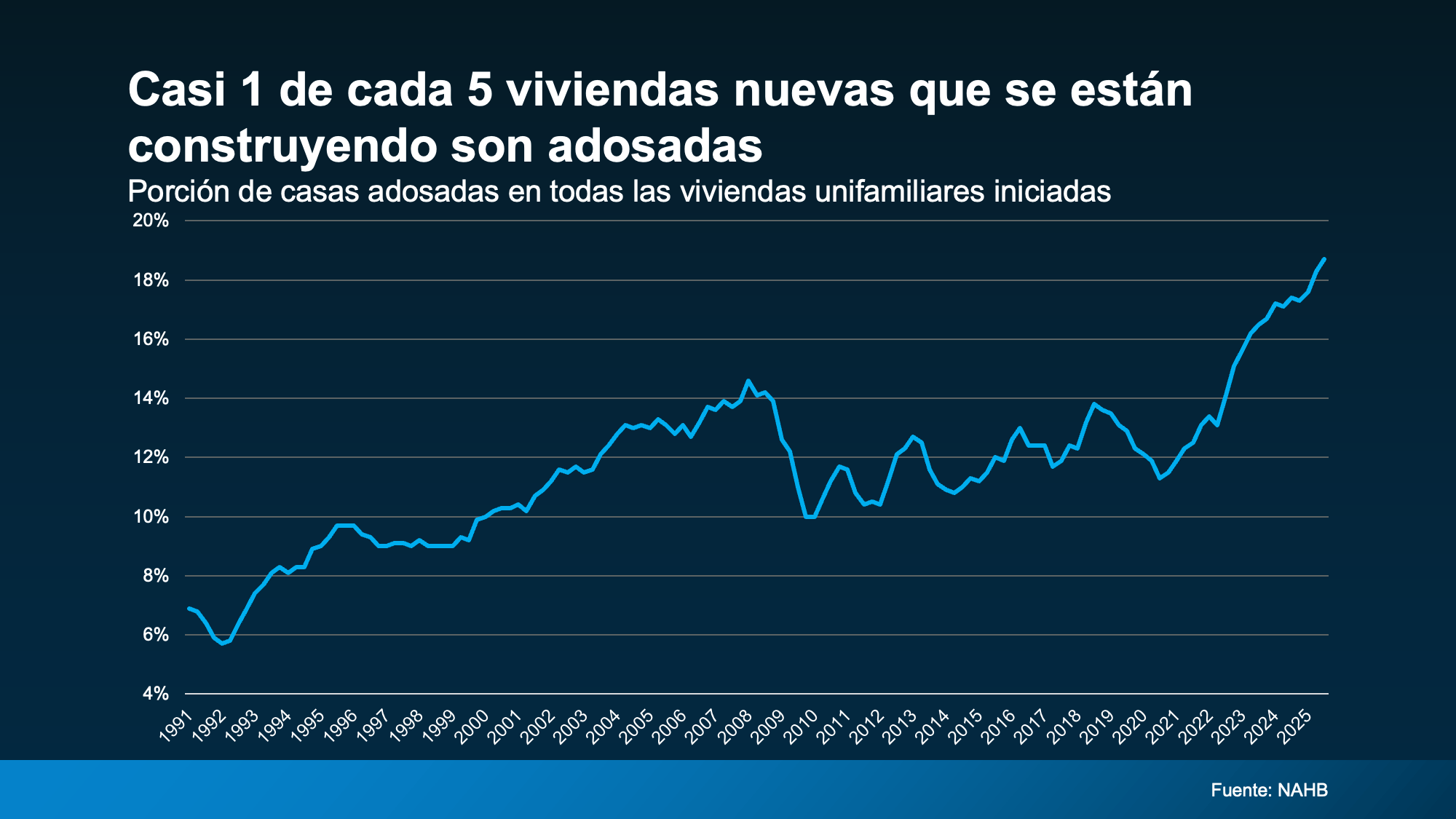 Los constructores están construyendo más casas adosadas que en décadas. De hecho, si se observan los datos de la Asociación Nacional de Constructores de Viviendas (NAHB por sus siglas en inglés), casi 1 de cada 5 viviendas unifamiliares nuevas que se construyen hoy en día es una casa adosada. Es la mayor porción registrada (ver la gráfica abajo):