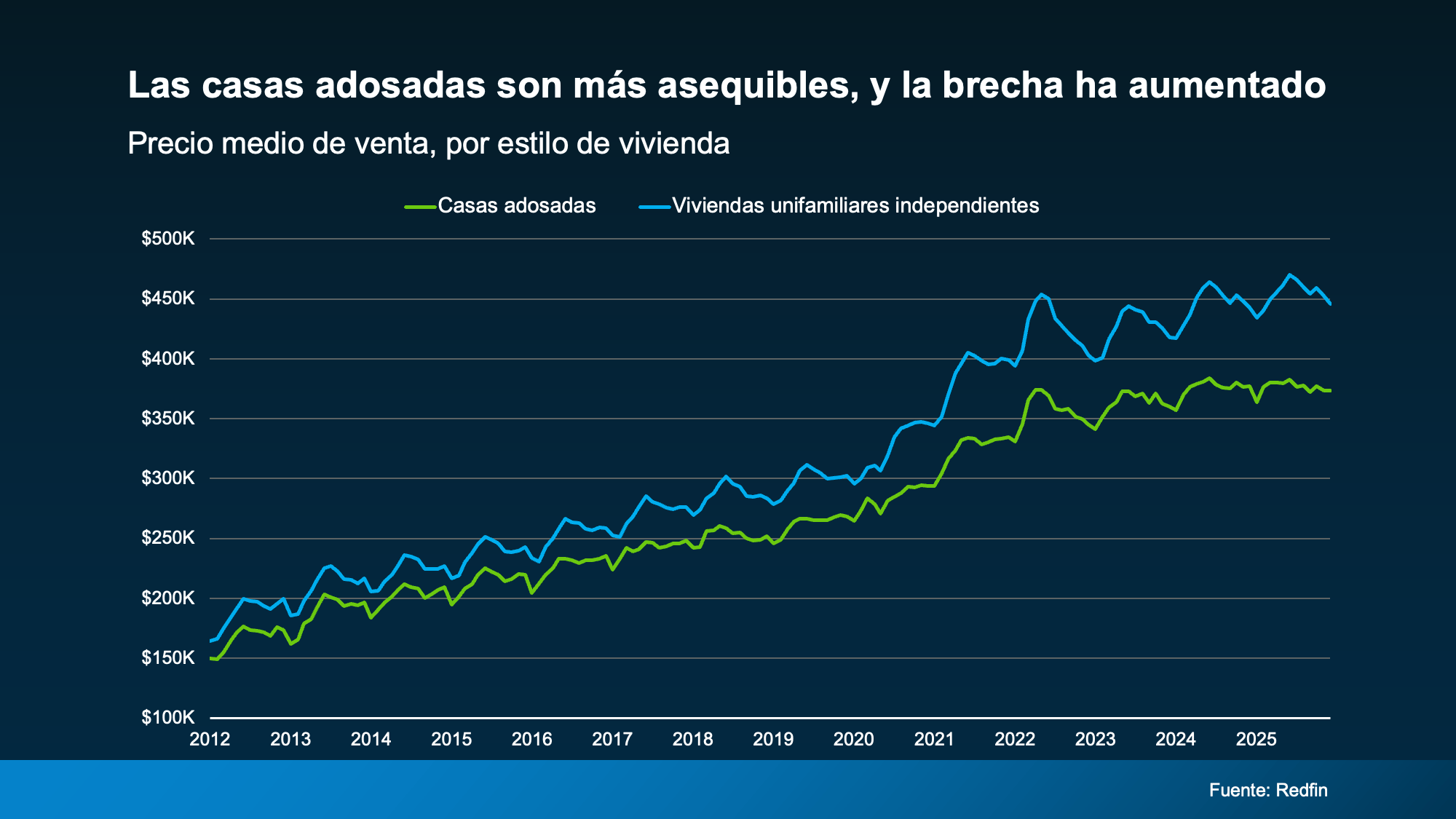 Aunque los precios varían según el mercado, los datos de Redfin muestran que las casas adosadas suelen tener precios más bajos que las casas unifamiliares independientes a nivel nacional. Y esa brecha ha aumentado en los últimos años a medida que la oferta de este estilo de viviendas también ha aumentado (ver la gráfica abajo):